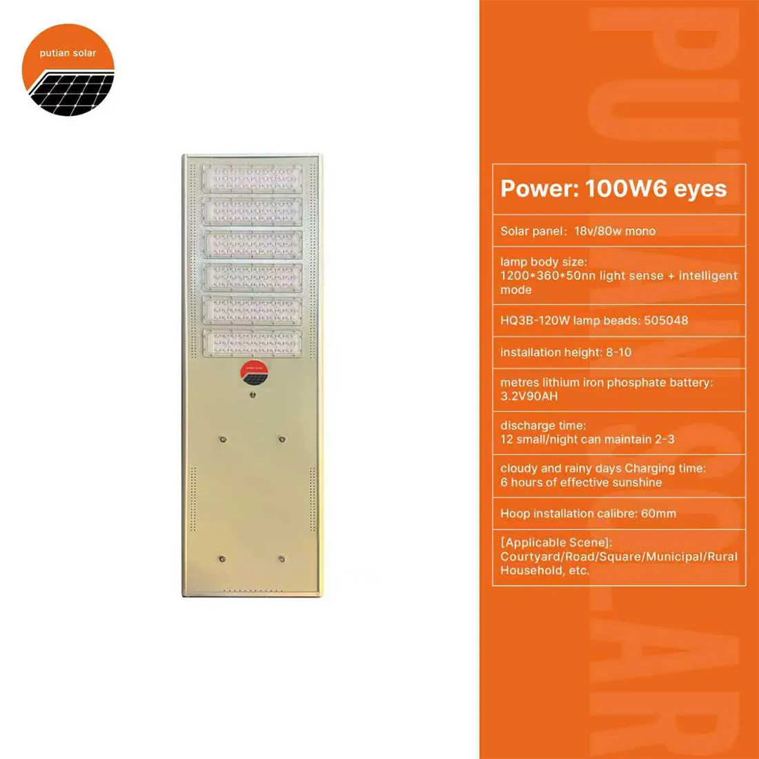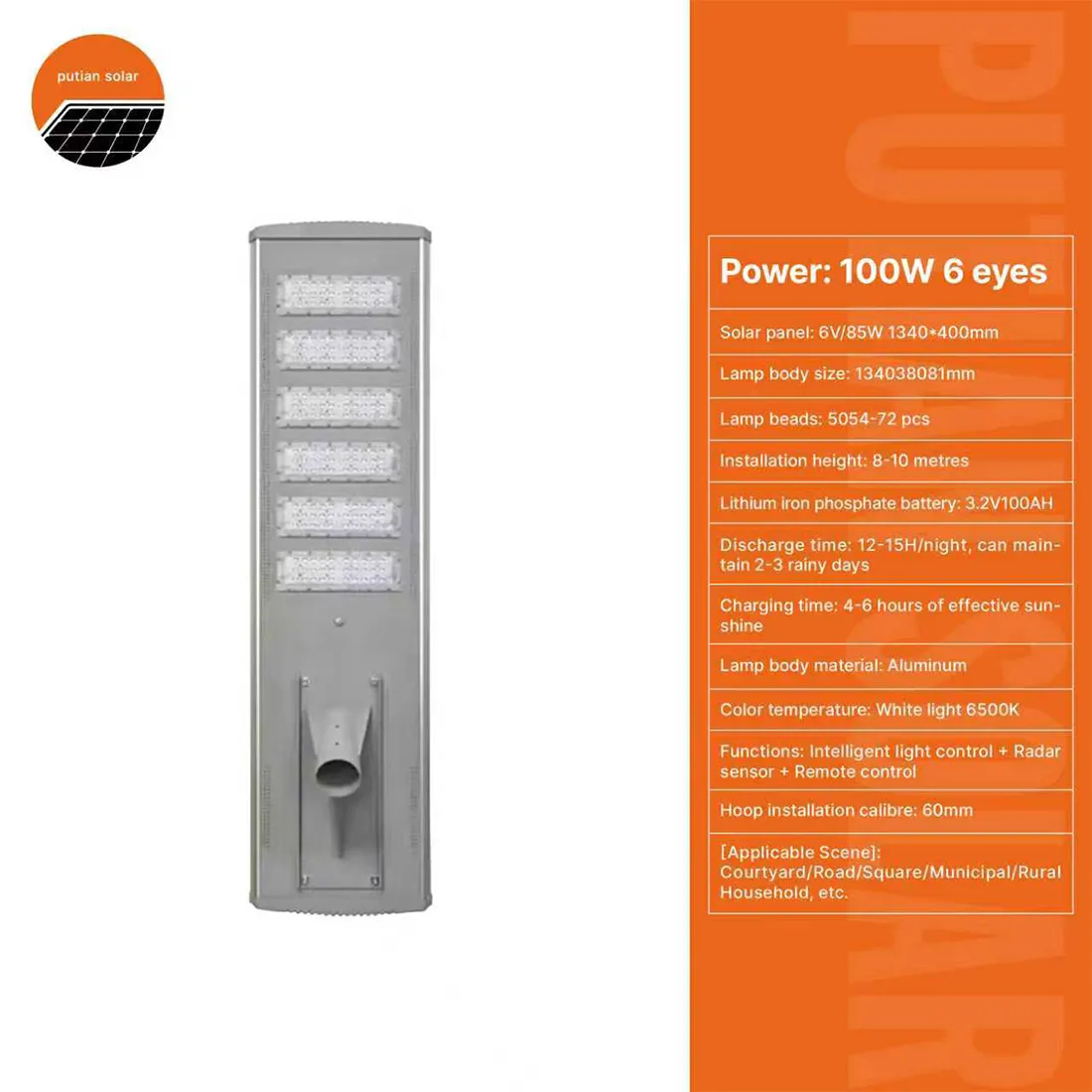 Putian Solar All In One Solar Street Light 100W 6 Eyes